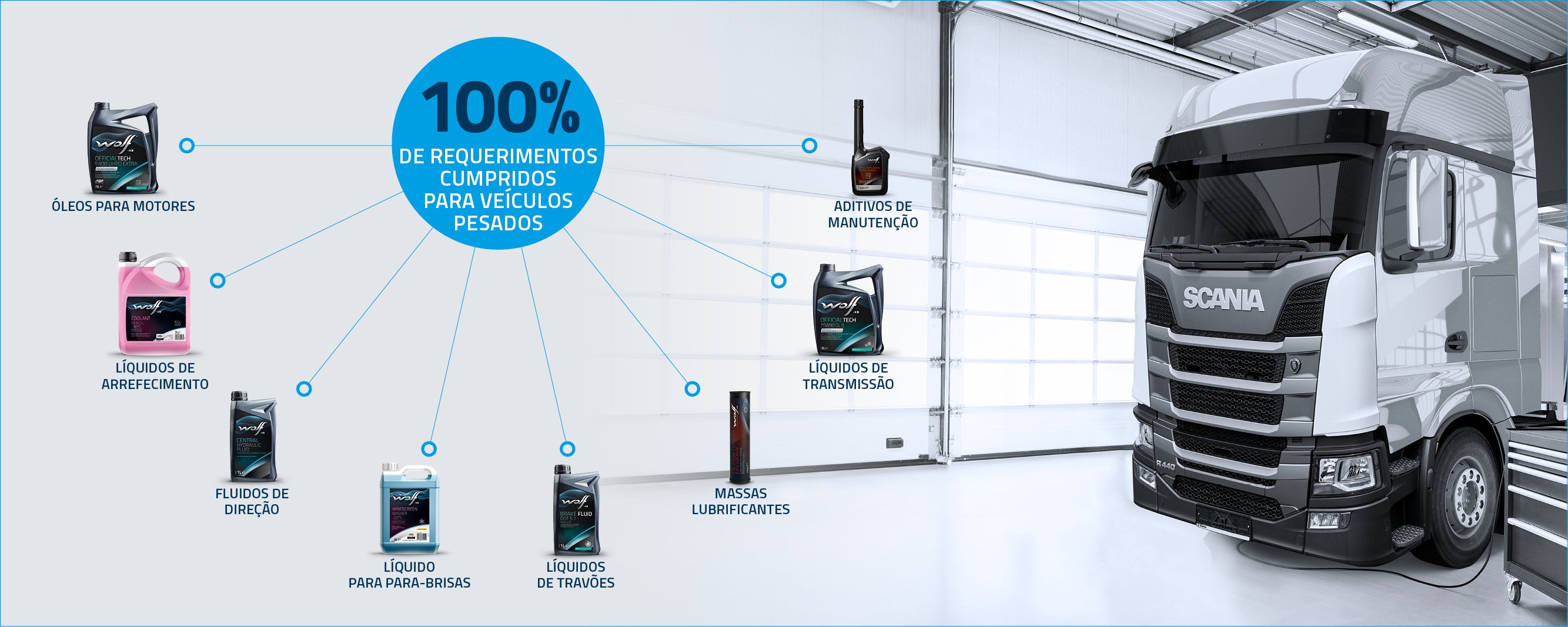 A Wolf oferece uma gama de lubrificantes de óleo de motor aprovados de acordo com as mais recentes especificações, fornecidas pela SCANIA, para veículos de estrada pesados.
